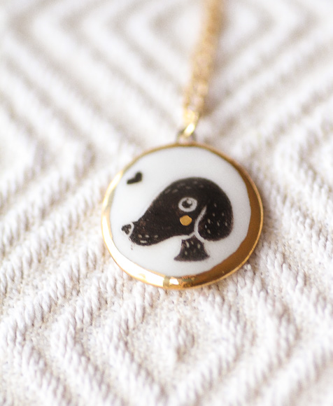 Medallita modelada a mano en porcelana de alta temperatura, con ilustración exclusiva y bisel pintado con lustre de oro.