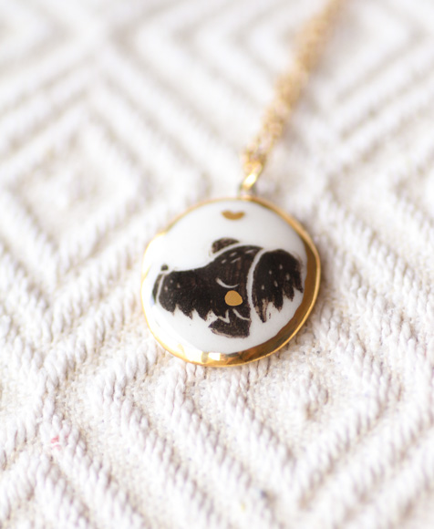 Medallita modelada a mano en porcelana de alta temperatura, con ilustración exclusiva y bisel pintado con lustre de oro.